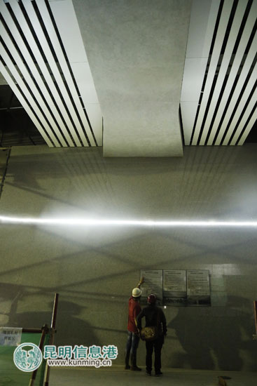 众所周知,昆明南站主站房外观形似孔雀开屏,其内部装修将会呈现怎样的呢?昨天,在主站房地下层的旅客出站通道,记者目睹了“装修样板区”。