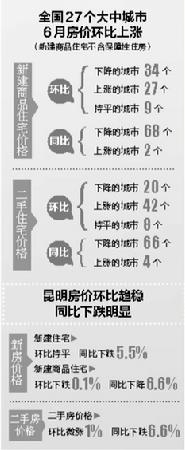 昨日,国家统计局发布今年6月份70个大中城市住宅销售价格变动情况。从全国来看,房价环比上涨城市个数增加,涨幅略有扩大,房价同比降幅继续收窄。就昆明房价而言,环比趋于稳定,同比则下跌幅度较大。而大理房价,与去年同期相比,新建住宅同比下跌5.3%,二手房同比下跌6.7%。