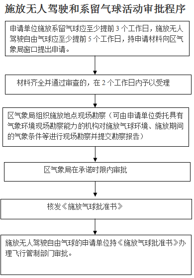 申请单位施放系留气球应至少提前3个工作日,施放无人驾驶自由气球应至少提前5个工作日,持申请材料向区气象局窗口提出申请——材料齐全并通过审查的,在2个工作日内予以受理——区气象局组织施放地点现场勘察——区气象局在承诺时限内审批——核发《施放气球批准书》——施放无人驾驶自由气球的申请单位持《施放气球批准书》办理飞行管制部门审批。