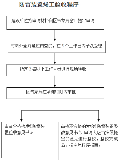 建设单位持申请材料向市气象局窗口提出申请——材料齐全并通过审查的,在5个工作日内予以受理——市气象局在承诺时限内委托防雷检测服务机构出具《防雷装置施工质量监督与验收综合检验报告》并审批——审查合格核发《防雷装置验收意见书》。