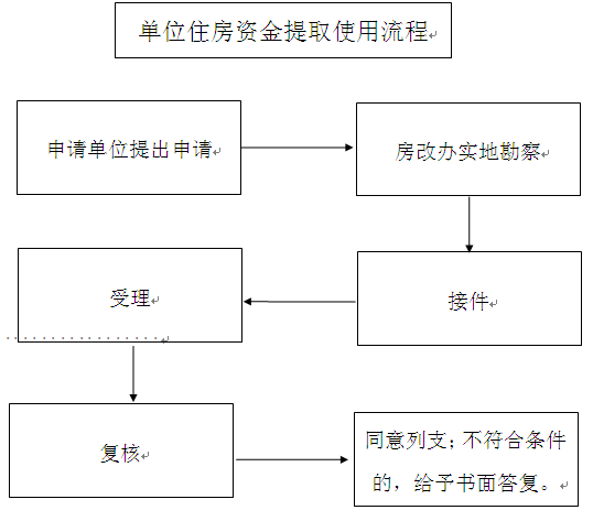 申请单位提出申请——房改办实地勘察——接件——受理——复核——同意列支;不符合条件的,给予书面答复。